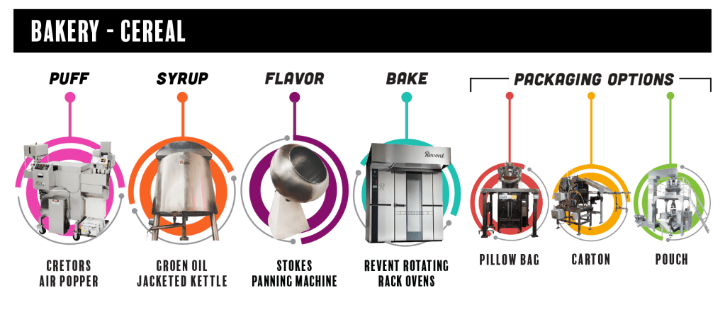Traditional Cereals – Featuring ingredients like wheat, corn, rice, or potato, we can source these dried pasta-like pellets from a variety of vendors and puff them using hot air. Once puffed, we flavor them with a variety of syrups to achieve desired flavor profiles. Served with milk or eaten on its own, Traditional Cereals are the standard of national brands everywhere, and are typically light and crispy, while featuring both adult and children themed packaging. These can be fortified with additional vitamins and minerals in the flavoring syrup, to add increased nutritional value.