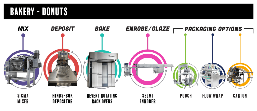 Chocolate Covered Donuts – Also baked like glazed donuts, these are enrobed in chocolate. These can also be customized with a wide variety of ingredients and packaged like glazed donuts either by individually wrapping them or packing them into stand-up pouches or pillow bags. These start with a liquid batter that is deposited into molds and baked. These can also be customized to feature specific dietary profiles as well as Better for You ingredients.
