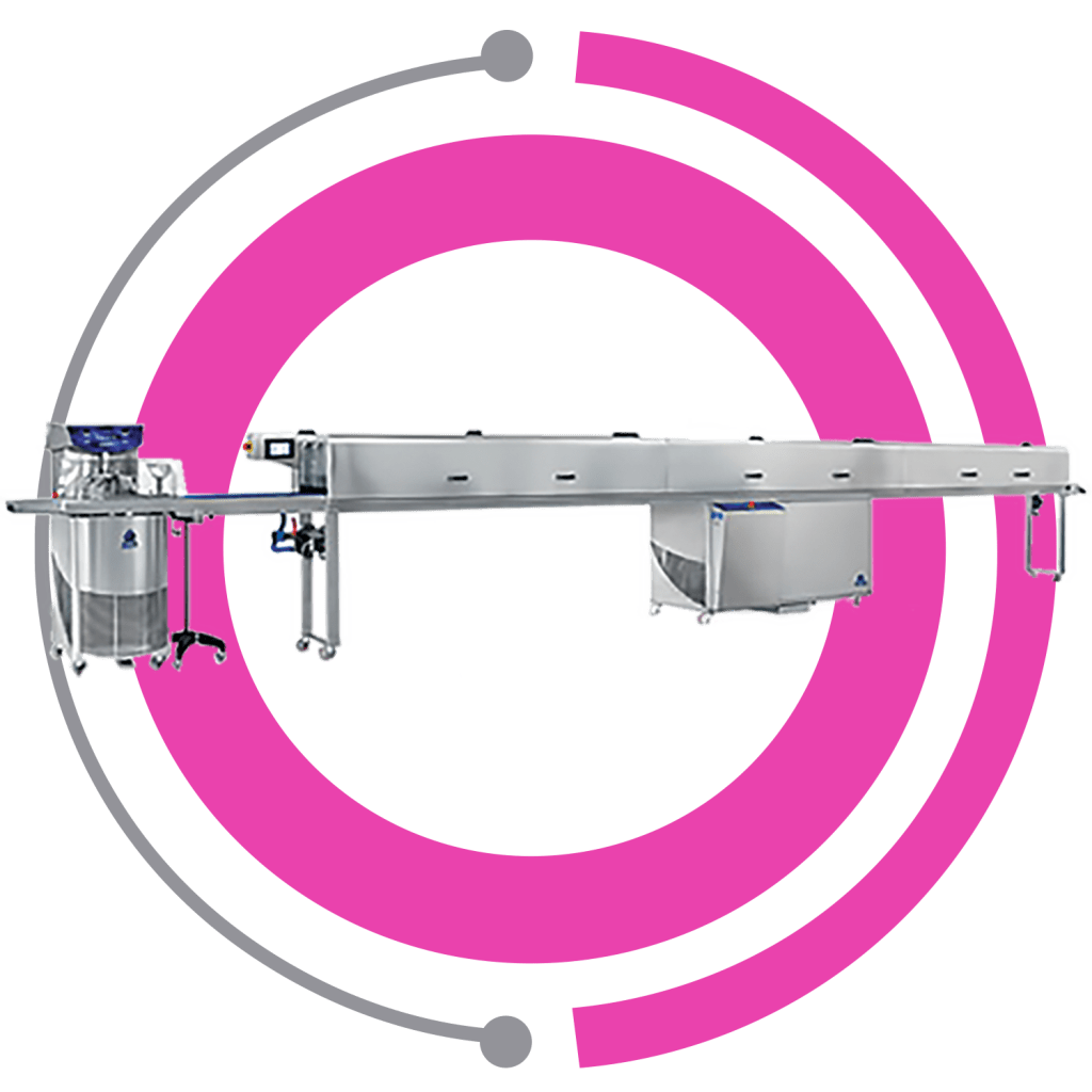 Made in Italy to be the top of the line for chocolate-making, the Selmi TopEx Enrober perfectly tempers chocolate and pours it into a perfect curtain through which baked goods and confections can be enrobed.